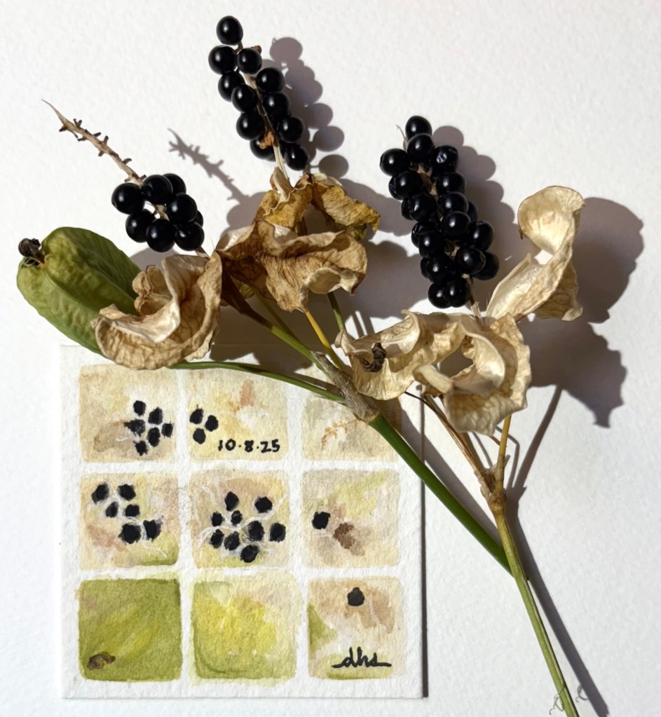 to reach the point where I could post Milksilk took a fair amount of patience as I first had to wait for seed season, then had to locate milkweed pods, next had to paint my swatches, finally had to undertake the many and considerable challenges of capturing a pleasing photograph of those pesky parachute-wannabes. I’ll leave out all but one anecdote from that long photo-shoot story, which is this: picture my having painstakingly set up swatch, pod, and floss in my improvised photography ‘studio’ (think bed with large sheet of white watercolor paper on it, overhead reading lights switched on, iPhone in hand); then picture Dave’s walking into what he thought was a bedroom and tossing a piece of clothing onto the foot of the bed.
